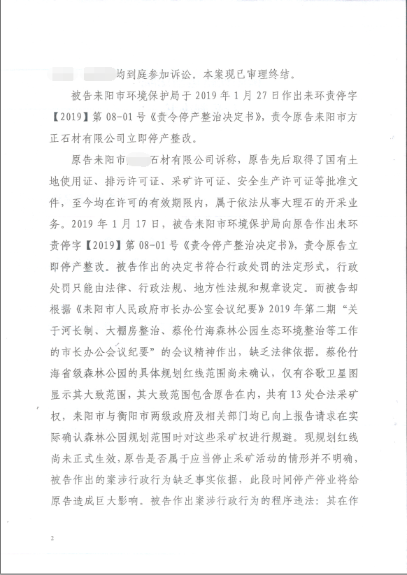 北京吴少博律师事务所近期代理案件:原告石材有限公司诉称,原告先后取得了国有土地使用证、排污许可证、采矿许可证、安全生产许可证等批准文件,至今均在许可的有效期限内,属于依法从事大理石的开采业务。2019年1月17 0,被告*阳市环境保护局向原告作出耒环责停字【2019】第08-01号《责令停产整治决定书》,责令原告立即停产整改。被告作出的决定书符合行政处罚的法定形式,行政处罚只能由法律、行政法规、地方性法规和规章设定。而被告却根据《*阳市人民政府市长办公室会议纪要》2019年第二期“关于河长制、大棚房整治、蔡伦竹海森林公园生态环境整治等工作的市长办公会钗纪要”的会议精神作出,缺乏法律依据,蔡伦竹海省级森林公园的具体规划红线范围尚未确认,仅有谷歌卫星图显示其大致范围,其大致范围包含原告在内,共有13处合法采矿权,*阳市与衡阳市两级政府及相关部门均已向上报告请求在实际确认森林公园规划范围时对这些采矿权进行规避.现规划红线尚未正式生效,原告是否属于应当停止釆矿活动的情形并不明确,被告作出的案涉行政行为缺乏事实依据,此段时间停产停业将给原告造成巨大影响,被告作出案涉行政行为的程序违法:其在作出案涉行政行为前,没有实际调查蔡伦竹海省级森林公园的规划范围与原告矿区范围是否存在重叠;没有对原告进行调查问话并制作调查笔录与询问笔录;没有给予原告陈述、申辩的权利;在作出行政行为后,也没有告知原告享有提起行政复议或者行政诉讼的权利.综上,被告2019年1月27日作出的耒环责停字(20191第08-01号《责令停产整治决定书》违法,请求法院判决撤销,并判决诉讼费由被告承担.