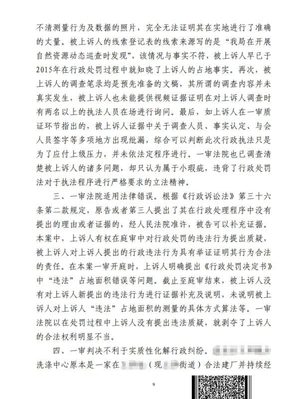 本案中,当事人是在某镇行政机关(现街道办)的指引下与当地村委会及村民签订用地协议,建厂经营,依法成立L洗涤中心。2021年7月,某县行政机关受上级压力,诱骗当事人配合调查,在程序多处违法的情况下做出行政处罚决定。面对此情况,当事人委托律师对处罚决定提起诉讼。由于一审判决驳回了当事人诉讼请求,当事人不服提起上诉,后经二审审理,法院最终确认一审判决适用法律错误,依法撤销一审判决及被上诉人某自然资源局作出的《行政处罚决定书》。