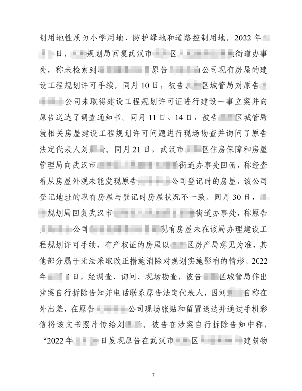 经审理查明:某制冷公司系武汉市某区地块的国有土地使用权人,国有土地使用权证证载土地用途为工业用地,使用权类型为划拨,面积*㎡。该公司持有的房屋产权证显示,该公司在某区有两栋建筑面积分别为*平方米和*平方米的1层砖木结构房屋、设计用途工、交、仓,另有一栋建筑面积*平方米的1层混合结构房屋、设计用途其他。两房屋产权证办理时间分别为2004年2月X日、7月X日。 2004年后,某制冷公司在原址陆续进行了拆除、加盖、改扩建。根据智慧武汉国土空间基础信息平台(一张图)查询结果,该地块的规划用地性质为小学用地、防护绿地和道路控制用地。2022年3月,某规划局回复武汉市某区行政机关街道办事处,称未检索到原告某制冷公司现有房屋的建设工程规划许可手续。同月10日,被告某区城管局对原告某制冷公司未取得建设工程规划许可证进行建设一事立案并向原告送达了调查通知书。 2022年4月,经调查、询问、现场勘查,被告某区城管局作出涉案自行拆除告知并电话联系原告法定代表人刘某,因刘某自称在外出差,于是在原告某制冷公司现场张贴和留置送达并通过手机彩信将该文书照片传给刘某。被告在涉案自行拆除告知中称,2022年2月28日发现原告在武汉市某区建筑物未取得建设工程规划许可证进行建设,违法建设工程建筑面积*平方米,该行为违反了《中华人民共和国城乡规划法》第二条第一款、第四十条第一款和《武汉市城乡规划条例》第二条、第四十五条、第六十一条的规定,《武汉市控制和查处违法建设条例》第三条第一款,依据《中华人民共和国城乡规划法》第六十四条和《武汉市城乡规划条例》第六十条的规定应自行拆除涉案违法建筑物(构筑物)拒不拆除的,将依法强制拆除,所需费用由原告自行承担并告知原告可在收到本告知书后三日之内提出陈述、申辩意见逾期不提供陈述、申辩意见,视为放弃此权利,本机关将依法作出处理决定”。并先后作出涉案限期拆除决定及某城管听通字(02 )号文件送达原告,要求原告限期内自行拆除,逾期不拆除的,将依法强制拆除,同时通知原告某制冷公司于2022年4月X日X时参加听证。 此后,原告某制冷公司直接提起行政诉讼要求撤销涉案限期拆除决定。